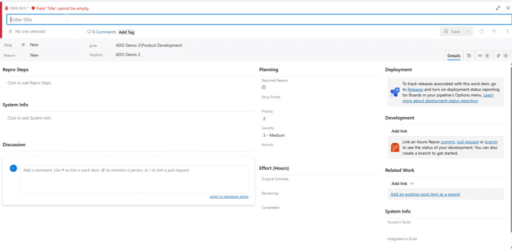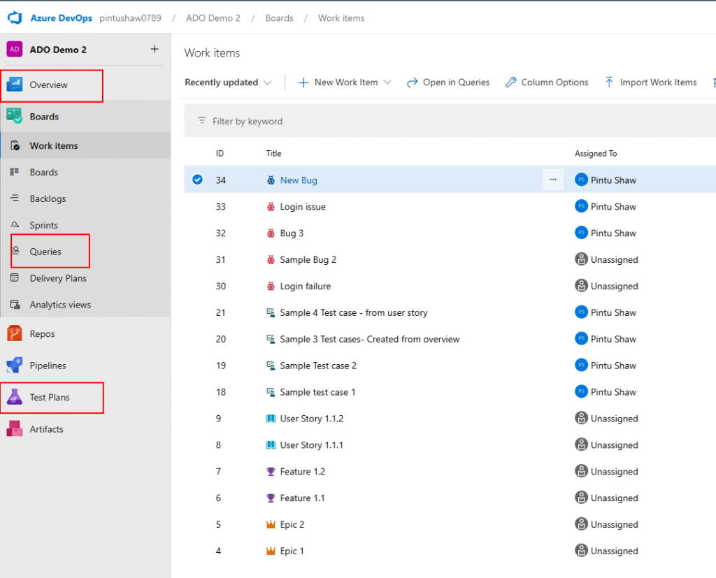 - Contains: Epics → Features → User Stories → Tasks → Bugs